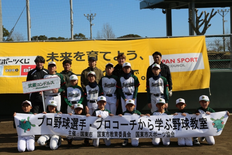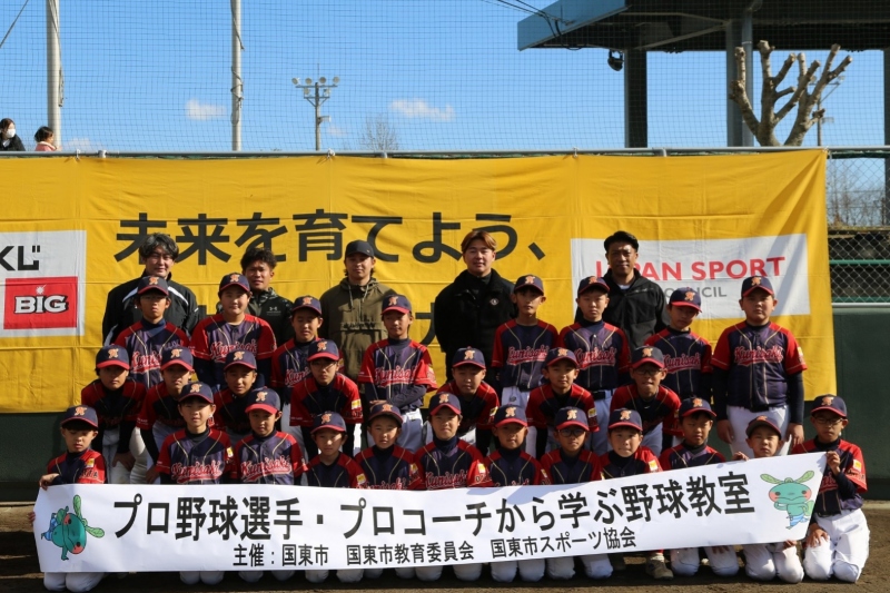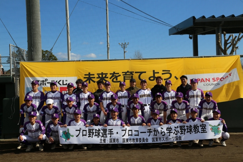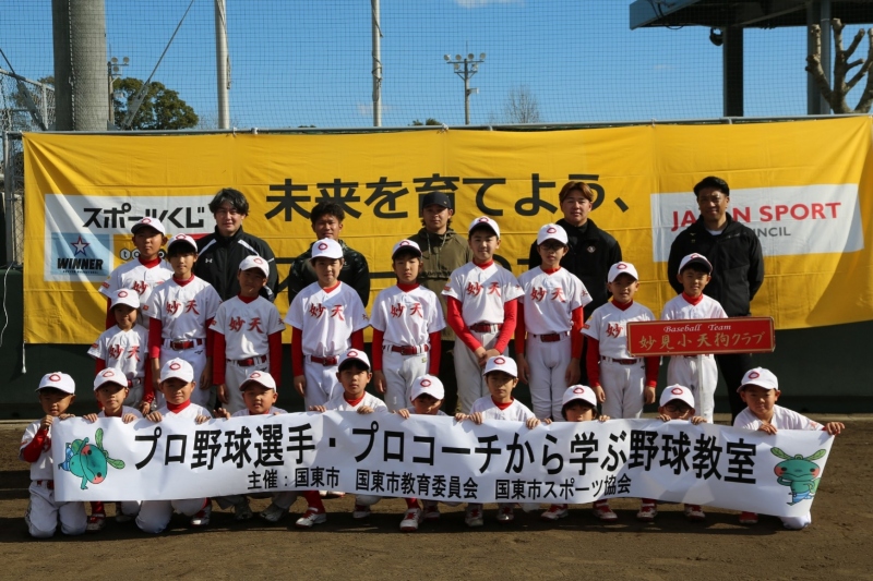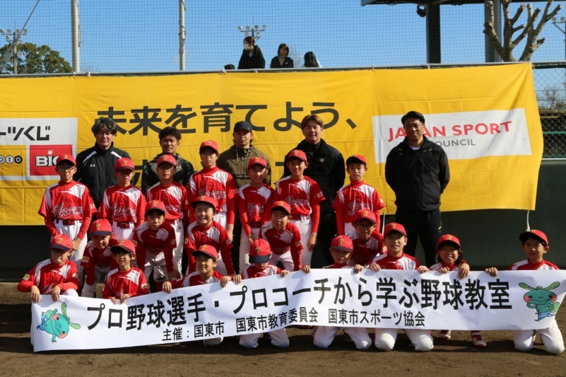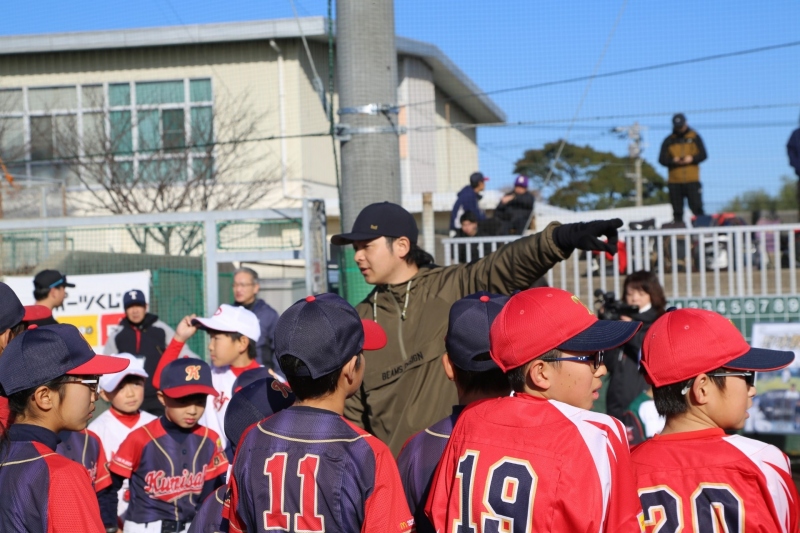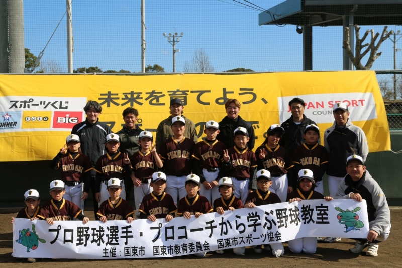 国東市内小・中学生が参加し、憧れのプロ野球選手から指導してもらいました。